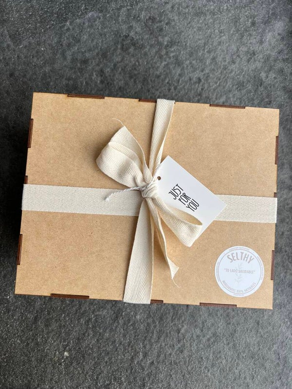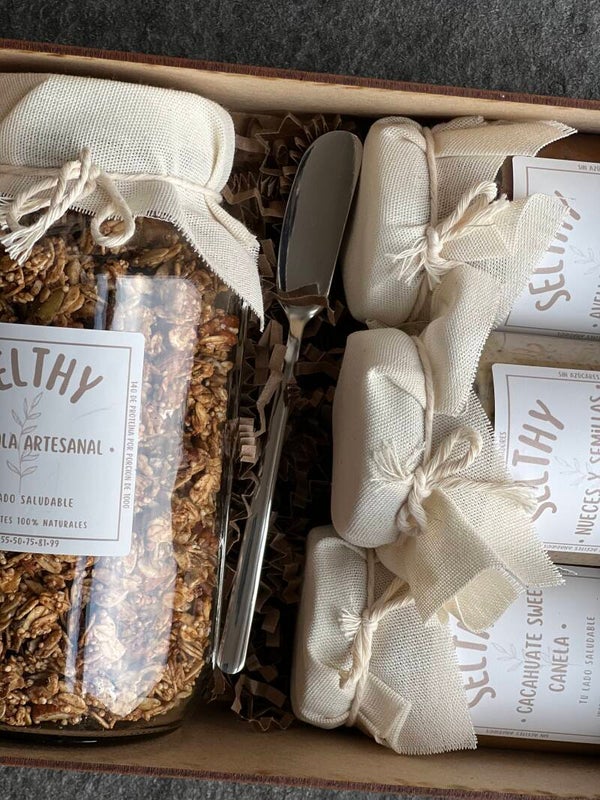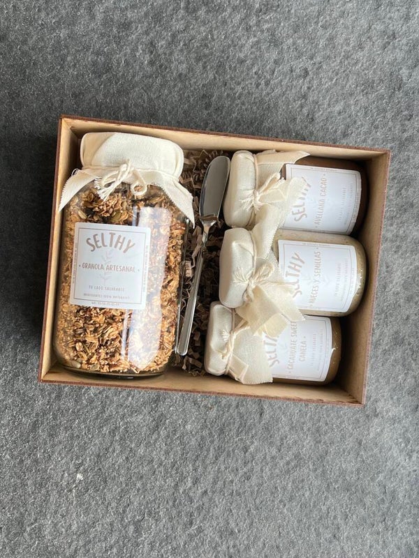 Caja de madera reutilizable que incluye 3 spreads de 240gr cada uno y 1 frasco de granola de 500gr. Sabores a elegir.